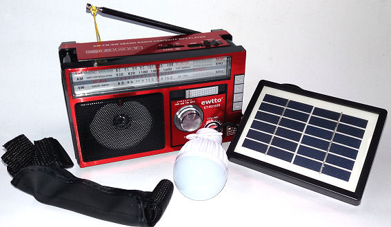 AM/FM/SW, USB, SD, panel solar 6V, linterna, ampolleta led